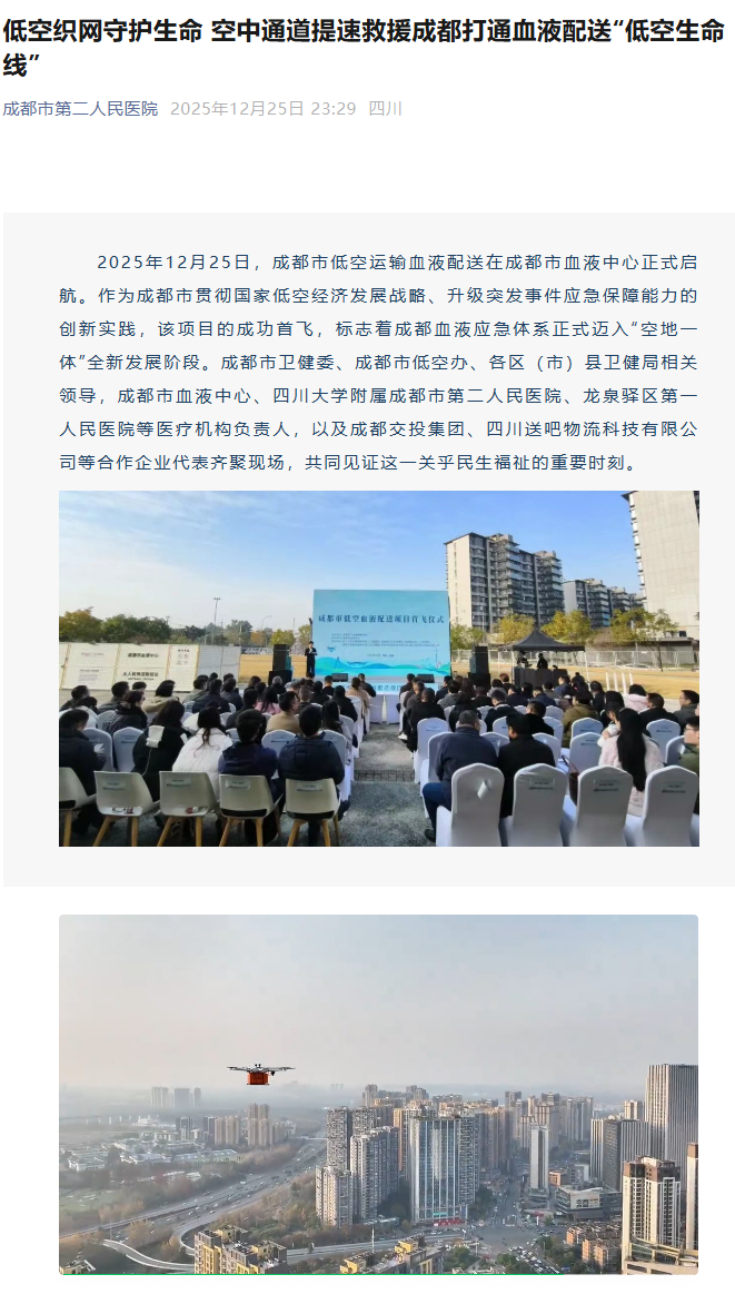 项目由成都市卫健委统筹指导,成都市血液中心牵头组织、具体实施,联合多家医疗机构与骨干企业形成“政企协同、多方联动”的创新合作格局。其中,成都交投集团负责低空基础设施规划建设,四川送吧物流承担低空运输核心任务。