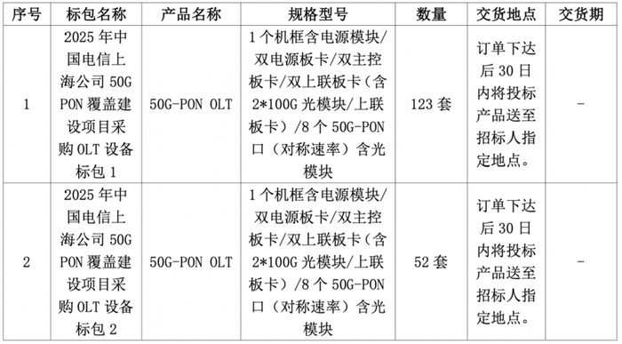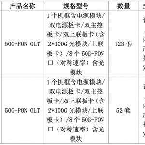 C114讯 12月29日消息(水易)来自中国电信阳光采购网消息,2025年中国电信上海公司50G-PON覆盖建设项目采购OLT 设备已完成评审。