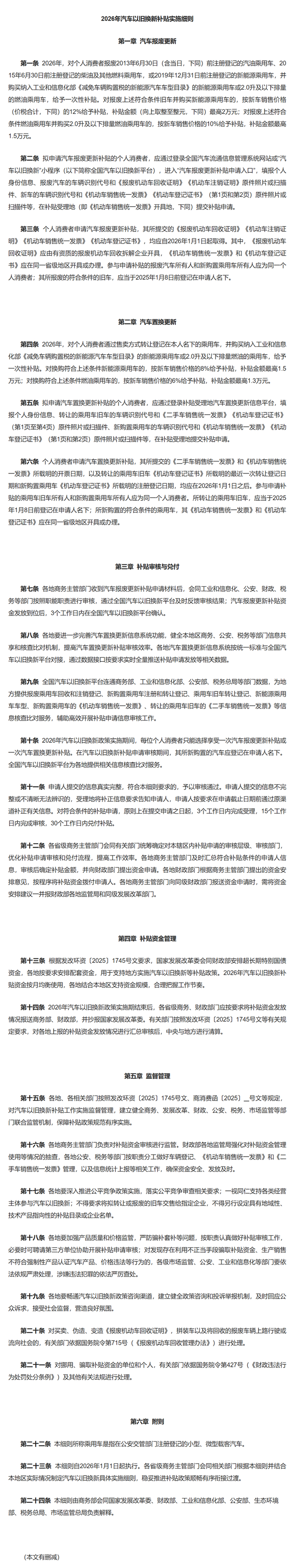 快科技12月31日消息,商务部等8部门办公厅今日发布关于印发《2026年汽车以旧换新补贴实施细则》的通知。