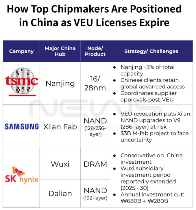 台积电并非唯一面临VEU到期的机构。今年八月,美国商务部突然撤销了对三星和SK海力士中国晶圆厂的全面VEU授权。当120天宽限期于12月31日结束时,两家公司必须获得美国批准,从1月1日起开始设备运输。