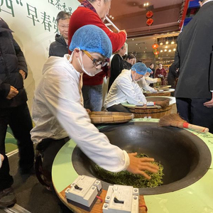 元旦假期首日,上午9点多,前门大街热闹非凡,老舍茶馆也迎来新年第一拨游客。“新年好!老舍茶馆可以免费参观。”工作人员热情地在门口邀请着游客们入内参观。步入茶馆二层,2026年广西“早春第一茶”开锅炒制暨对接活动在这里展开。只见四位炒茶师傅坐定,身前的大锅开始预热,竹簸箕里是嫩绿的茶叶。这四位炒茶师傅都来自广西,这些茶叶头天刚空运到北京。