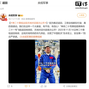 IT之家 1 月 2 日消息,@央视军事 今天(1 月 2 日)发布微博,神舟二十号乘组搭乘神舟二十一号飞船返回地球前的天地对话内容首次公开。这场天地同舟的非凡奔赴,兑现了中国航天“生命至上、安全第一”的庄严承诺。
