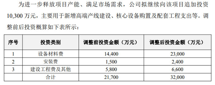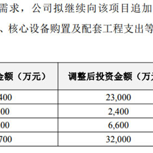 公告显示,本次投资调整后,项目各分项投资金额均有相应调整:设备材料费从 14,400 万元提升至 23,000 万元,安装费从 1,500 万元增至 2,400 万元,建设工程费及其他从 5,800 万元调整为 6,600 万元,三大类投资合计达 32,000 万元。
