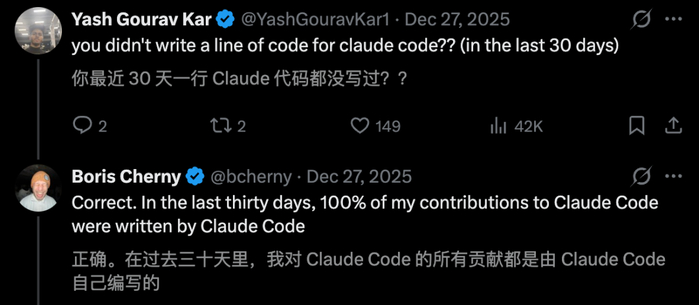 Anthropic 工程师自曝,过去一个月,自己对 Claude Code 的贡献,全部由 AI 100% 直出代码。