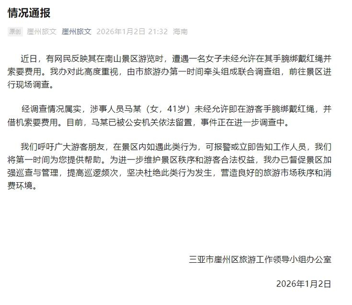 经调查情况属实,涉事人员马某(女,41岁)未经允许即在游客手腕绑戴红绳,并借机索要费用。目前,马某已被公安机关依法留置,事件正在进一步调查中。