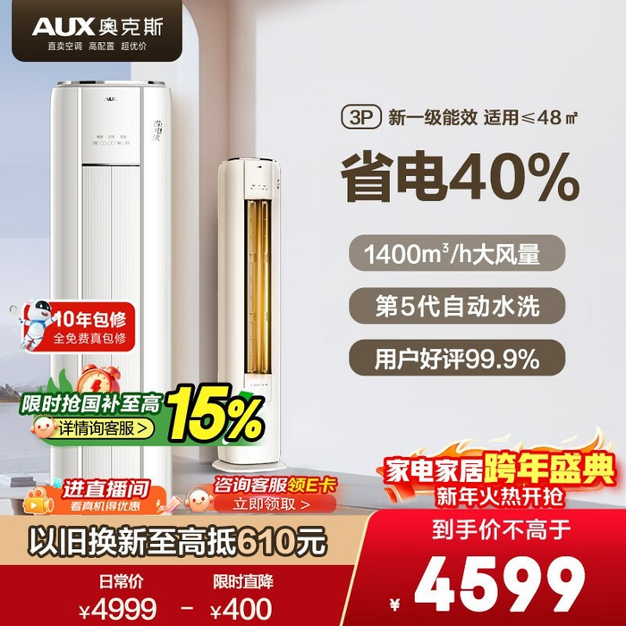 奥克斯3匹空调柜机热卖,到手低至3291元