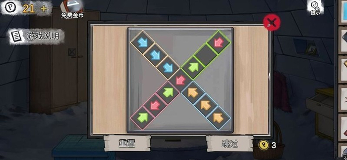 将红色方块移至循环箭头处,并依照图示进行调整。获取金属徽章与六角扳手后,用徽章开启右侧柜子的下层,取出螺丝刀。使用螺丝刀撬开围墙外山洞中的盖板,取出其中的电池。返回树林区域,将两块电池装入小木棚内的装置中,随后点击跳过动画(实际不可跳过),获得一个形似螺丝刀的镶嵌物。利用该镶嵌物打开雪屋衣柜中的盒子,取得内部的齿轮。前往围墙外侧,使用六角扳手拆卸门禁面板,将两个齿轮依次安装。注意齿轮机关仅可拉动两端,应先固定黑色齿轮,再依次安装白色、黄色与灰色齿轮。最后装上操纵杆并启动,即可开启大门。