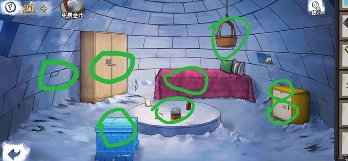 从桌上拿起蜡笔,打开铁罐取得发卡。掀开床单找到树杈,用它勾下篮子,拿到操纵杆和叉子。右侧柜子上层放着盐,用叉子撬开左侧砖块,得到方形滑块。用盐融化围墙外的冰雕,拾取蓝色箭头,融化过程令人不适。前往湖边车辆,用发卡修复卡住的开关,按下后获得齿轮。最后将蓝色箭头安装在雪屋的衣柜上。