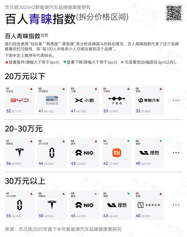 此外,在20-30万元区间,百人青睐指数前五的品牌为特斯拉、问界、蔚来、小米与理想。尽管理想与小米在本期指数中出现阶段性回落,但仍保持在该价格带的前五行列。