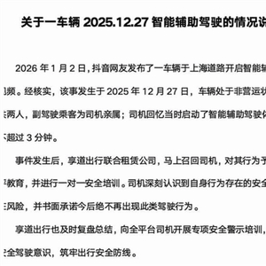 经核实,该事发生于2025年12月27日,车辆处于非营运状态,车内两人,副驾驶乘客为司机亲属;司机回忆当时启动了智能辅助驾驶体验,时长不超过3分钟。
