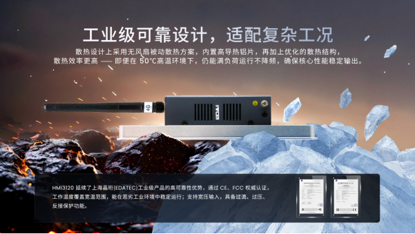 HMI3120 延续了上海晶珩工业级产品的高可靠性优势,通过 CE、FCC 权威认证,工作温度覆盖宽温范围,能在恶劣工业环境中稳定运行;支持宽压输入,具备过流、过压、反接保护功能。