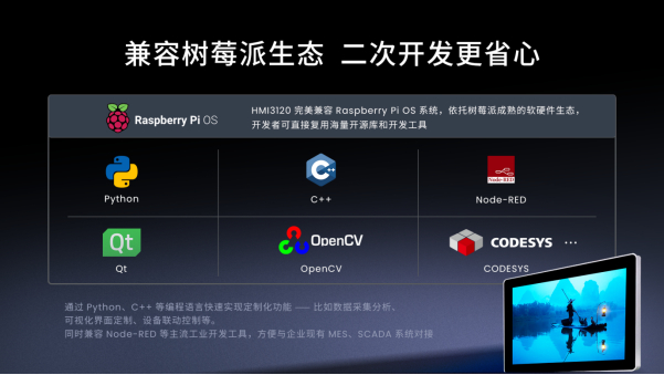 HMI3120 完美兼容 Raspberry Pi OS 系统,依托树莓派成熟的软硬件生态,开发者可直接复用海量开源库和开发工具,通过 Python、C++ 等编程语言快速实现定制化功能 —— 比如数据采集分析、可视化界面定制、设备联动控制等。同时兼容 Node-RED 等主流工业开发工具,方便与企业现有 MES、SCADA 系统对接。