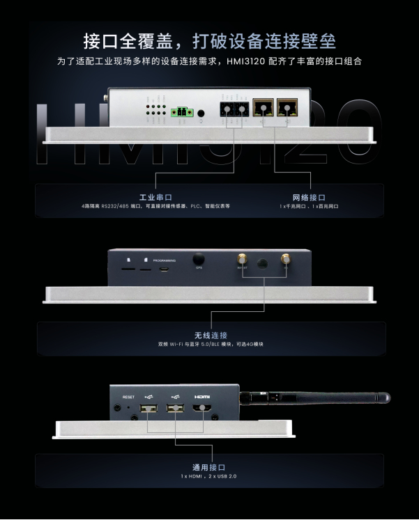 为了适配工业现场多样的设备连接需求,HMI3120 配齐了丰富的接口组合: