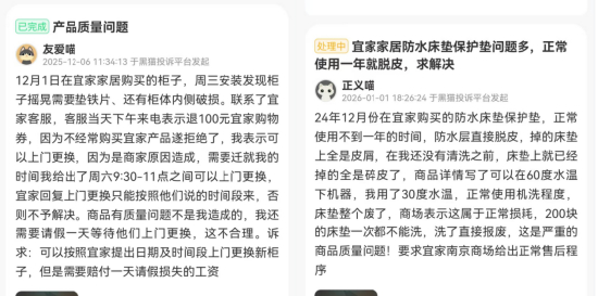 《BUG》栏目注意到,在黑猫投诉、小红书等平台上,目前也充斥着大量宜家产品存在质量问题、售后服务不佳等的投诉。有用户反馈,宜家新买的柜子,安装时发现有故障,要求上门退货却被要求“请假”等对方上门取货。也有用户反馈称,“宜家防水床垫使用一年就脱皮,200元的床垫一次都不能洗。”