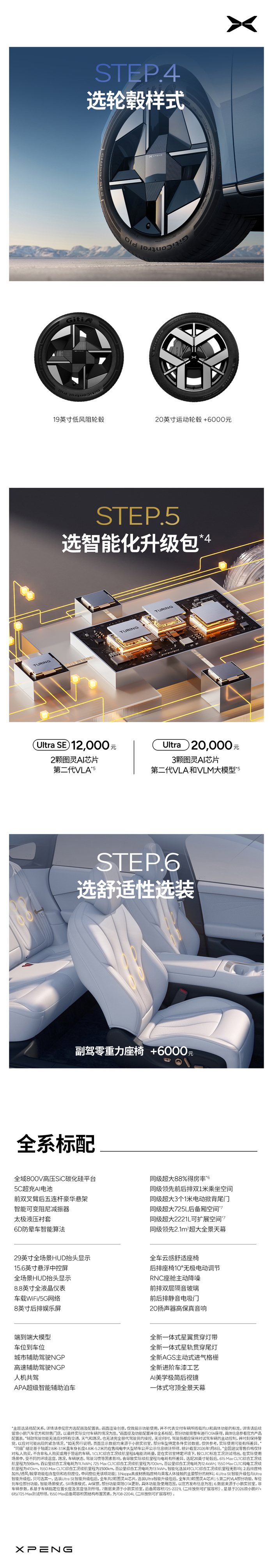 智能驾驶硬件方面,全系标配 1 颗图灵 AI 芯片、毫米波雷达、超声波雷达及多颗高清摄像头,提供包括城市与高速辅助驾驶 NGP、智能泊车、遥控泊车、循迹倒车等辅助驾驶功能。用户还可通过选装 Ultra SE 或 Ultra 智能升级包,获得额外的图灵 AI 芯片、第二代 VLA 激光雷达及 OMS 舱内摄像头等功能升级。
