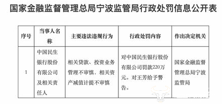 具体来看,2025年12月31日,民生银行因相关贷款、投资业务管理不审慎,相关资产减值计提不审慎等多项违法事实被国家金融监督管理总局宁波监管局罚款220万元;同时相关责任人王芳被给予警告。
