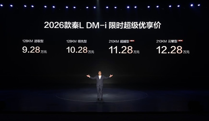 价格依然是发布会的核心,2026 款秦 L DM-i 的 210km 超越型售价为 11.68 万元,搭载云辇-C 的 210km 云辇行售价则为 12.68 万元,而入门的 128km 版本在享受购置税补贴后,起步价压到了 9.28 万元。