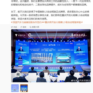 对了,前不久我们获得了中国首款 L3 自动驾驶正式牌照,很多朋友关心什么时候能体验。今天有一条好消息分享给大家,我们即将在重庆开启大规模 L3 自动驾驶体验,欢迎大家关注我们的官方信息。