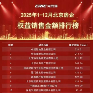 在2025年克而瑞发布的榜单中,则将中国建筑内各个地产公司分拆统计,中海地产也分拆成中海新城和北京中海统计。由此可见,中建智地、华润置地、中海新城位列2025年北京房企权益销售金额排行榜前三。