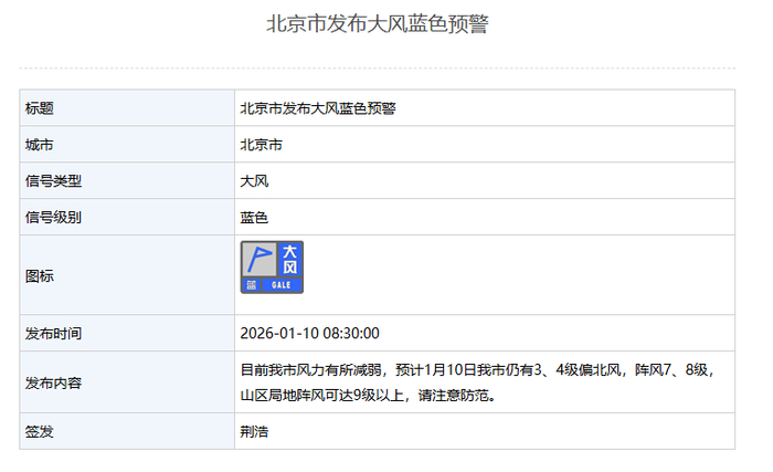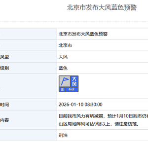 新京报讯 据北京市气象局消息,目前北京市风力有所减弱,预计1月10日北京市仍有3、4级偏北风,阵风7、8级,山区局地阵风可达9级以上,请注意防范。