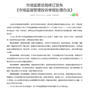 新京报讯 据市场监管总局网站消息,为适应市场监管新形势新要求、提升投诉举报处理质效、更好保护消费者和经营者合法权益,近日,市场监管总局修订发布规章第121号令《市场监督管理投诉举报处理办法》(以下简称《办法》)。《办法》的修订实施将有力健全统一权威、科学高效、便民利企的市场监管投诉举报处理体系,更好服务经济高质量发展、保障人民高品质生活。