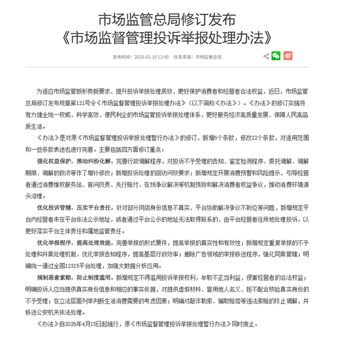 《办法》自2026年4月15日起施行,原《市场监督管理投诉举报处理暂行办法》同时废止。