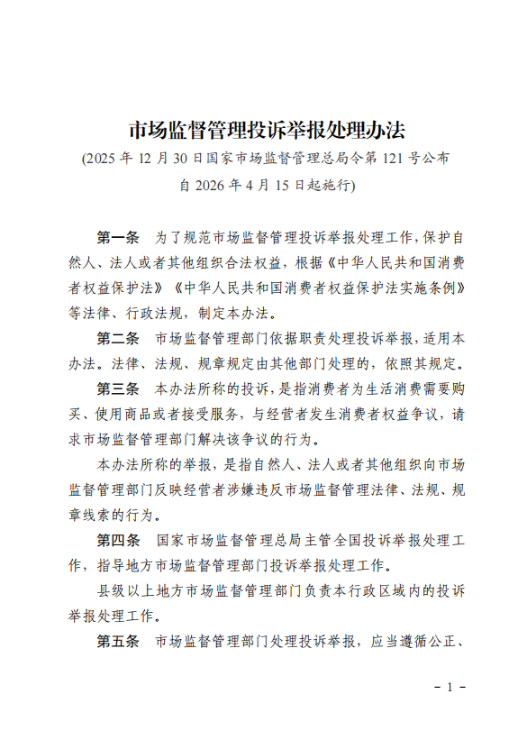 《办法》自 2026 年 4 月 15 日起施行,原《市场监督管理投诉举报处理暂行办法》同时废止。