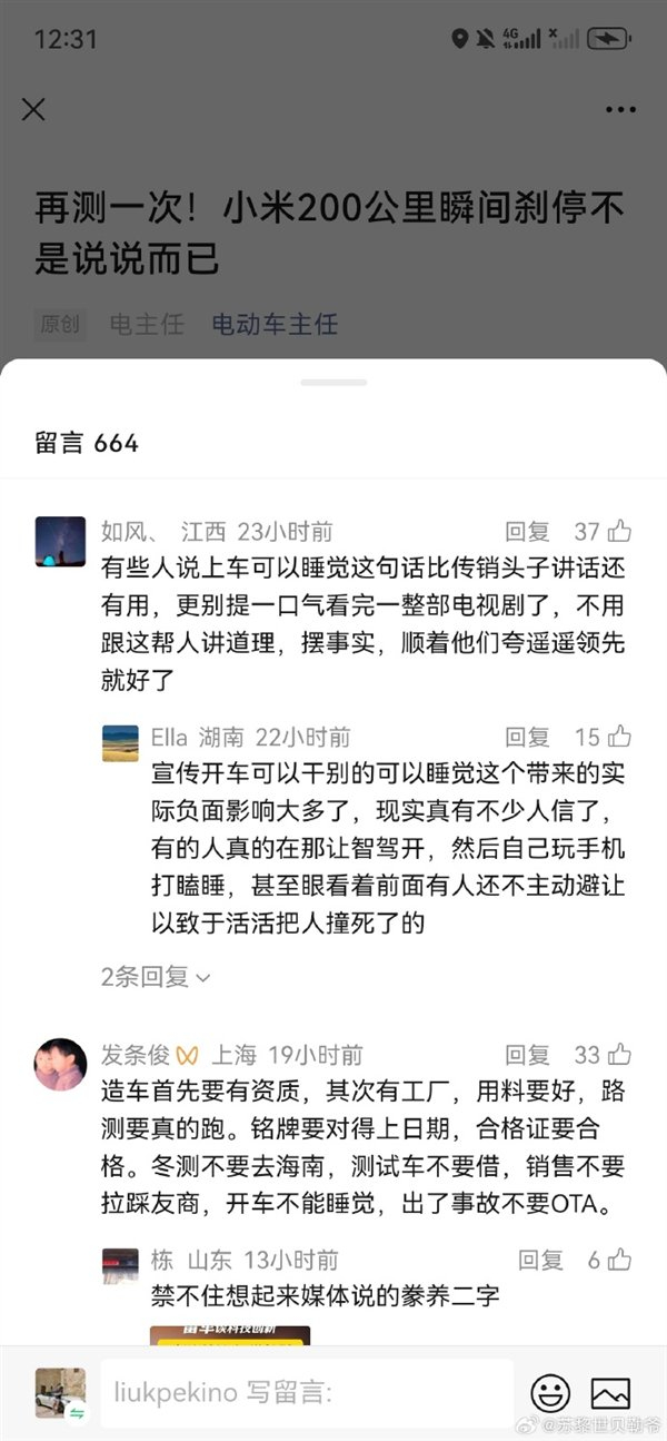 在评论区,不少网友开始正向解读“200公里瞬间刹停”。有网友并表示:“央视视新闻一样用‘瞬间’来表达速度非常快的意思,也没人会无聊到去质问这瞬间究竟是多久,能不能用瞬间形容,非拿这个表达主观感受的常见用词说事的人,只能说是故意针对小米挑刺找茬了。”