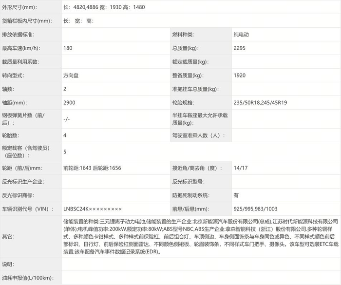 新款极狐阿尔法 S5 纯电版部分参数信息