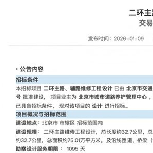近日,北京市公共资源交易服务平台发布了“二环主路、辅路维修工程设计招标公告”,根据此次招标公告,该项目作为“市管城市道路桥梁大修工程储备项目”已由北京市交通委员会批复,准许进行建设。