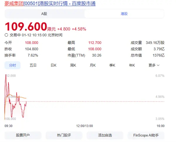 1月12日消息,今日,豪威集团正式在港交所主板挂牌上市,最新股价为每股109.60港元,市值突破1370亿港元,标志着豪威集团迈入A+H双资本平台的新阶段。