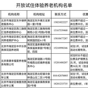 新京报讯 据“北京海淀”微信公众号消息,近日,海淀区民政局响应“北京市关于开展优质养老机构集中开放体验活动”的号召,遴选辖区内7家养老机构,正式推出“开放试住体验”服务。