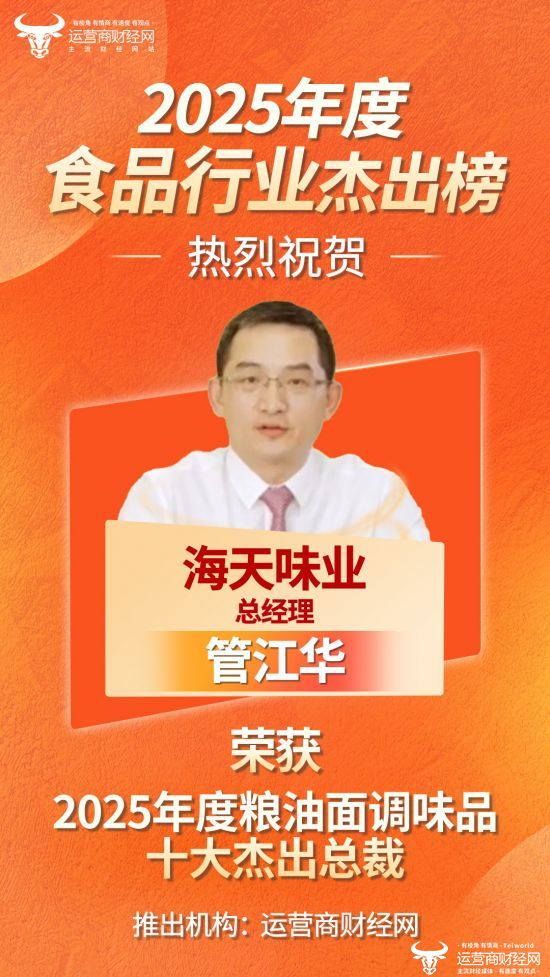 近日,运营商财经网正式推出“2025年度粮油面调味品十大杰出总裁”榜单,其中海天味业总裁管江华成功入选!