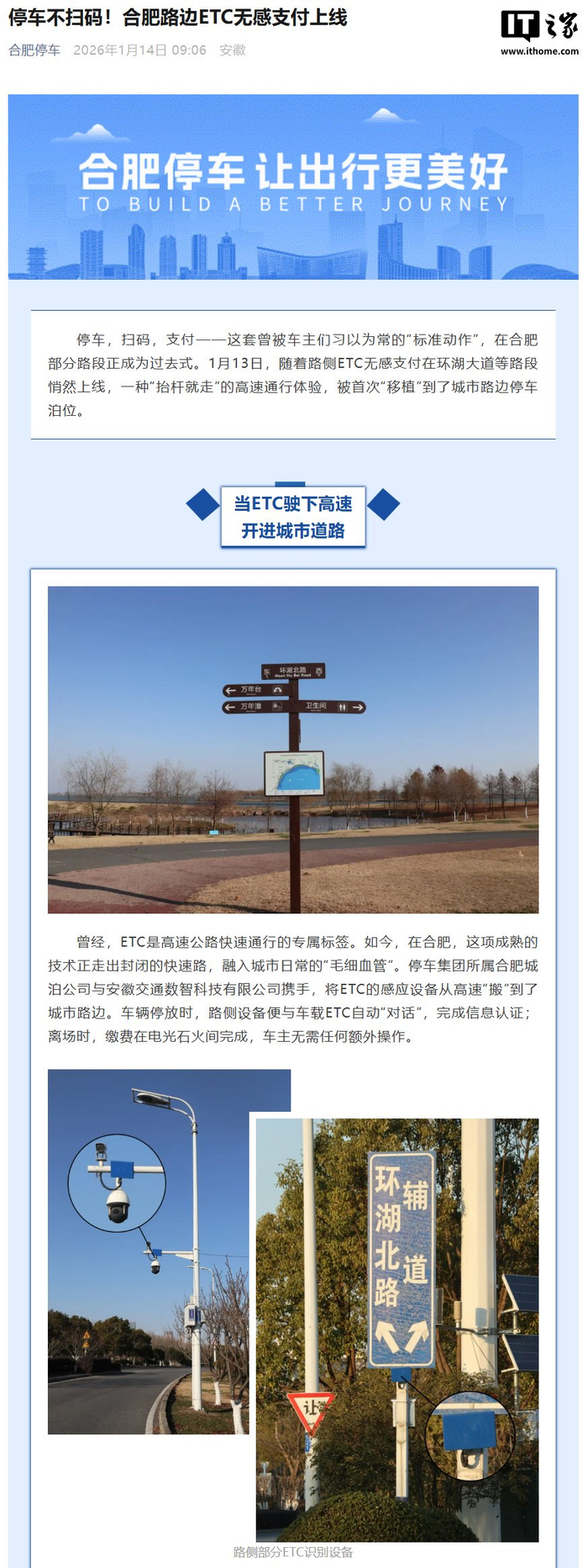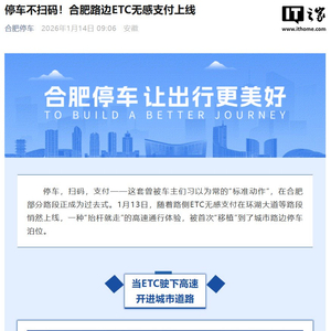 IT之家 1 月 14 日消息,据“合肥停车”公众号今日消息,1 月 13 日,随着路侧 ETC 无感支付在环湖大道等路段悄然上线,一种“抬杆就走”的高速通行体验,被首次“移植”到了城市路边停车泊位。