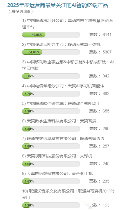 “2025年度运营商最受关注的AI智能终端产品”评选:深圳联通和中移云能项目投票激烈争第一