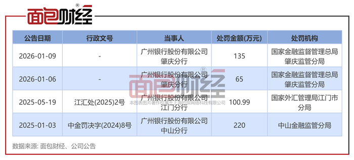 在此之前,2026年1月6日,该分行还因违规向小微企业转嫁抵押物财产保险保费;贷款管理不到位,贷款资金被挪用;按揭贷款贷前调查不到位,被国家金融监督管理总局肇庆监管分局罚款65万元。