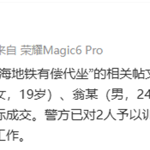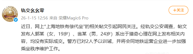 新京报讯 据@轨交幺幺零 消息,近日,网上“上海地铁有偿代坐”的相关帖文引起网民关注。经轨交公安调查,帖文发布人郭某(女,19岁)、翁某(男,24岁)系出于猎奇心理在网上发布相关内容,均没有实际成交。警方已对2人予以训诫,并将会同地铁运营企业进一步加强乘坐秩序维护工作。