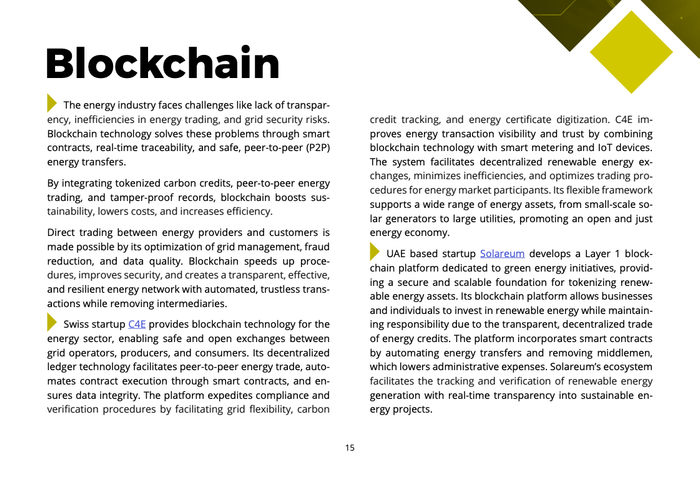 区块链与能源即服务分别占11%和7%。前者主要解决能源交易中的信任与效率问题,通过点对点交易和碳信用数字化降低摩擦成本;后者则以订阅制和按需付费模式,削弱高资本开支对能源转型的约束,尤其在新兴市场和分布式场景中释放需求潜力。