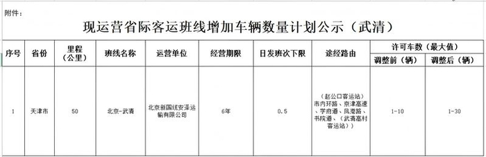 北京至武清省际客运班线数量拟从10辆调整为30辆