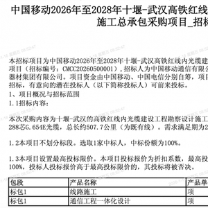 C114讯 1月16日消息(九九)中国移动采购与招标网日前发布2026年至2028年十堰-武汉高铁红线内光缆建设工程勘察设计施工总承包采购项目招标公告。采购内容为十堰-武汉的高铁红线内光缆建设工程勘察设计施工总承包服务,与电信共建一条288芯G.654E光缆,总长约507.7公里(为既有线)。需求满足期为2028年12月。