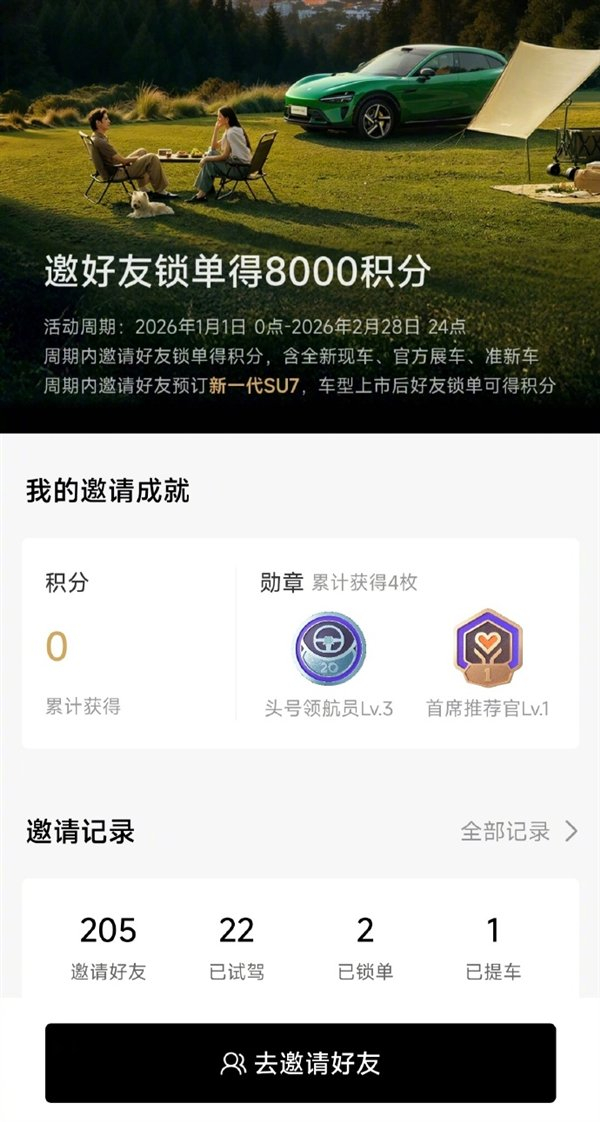 据了解,这是小米汽车刚刚上线不久的一项新政策:已锁单车主邀请好友小订并在新车上市后锁单,每成功1位即可获得8000积分,每人每自然年最多可参与10次,活动截止至2月28日24点。