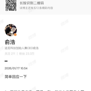 新浪科技讯 1月17日上午消息,追觅科技创始人兼CEO俞浩今日于微博发文回应“打造百万亿美元公司”言论称:“我说的是未来,不是一年,做出人类历史上第一个百万亿美金公司,确实是我的目标,是我和相信我们的人,用接下来二十年去奋斗的。”
