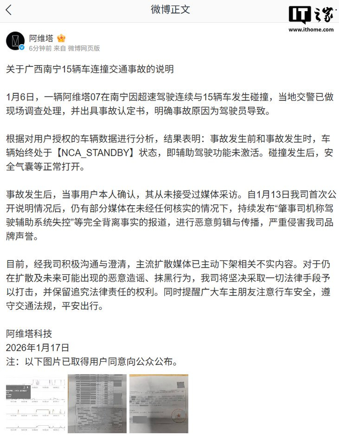 IT之家 1 月 17 日消息,阿维塔今晚发布“关于广西南宁 15 辆车连撞交通事故的说明”。1 月 6 日,一辆阿维塔 07 在南宁因超速驾驶连续与 15 辆车发生碰撞,当地交警已做现场调查处理,并出具事故认定书,明确事故原因为驾驶员导致。