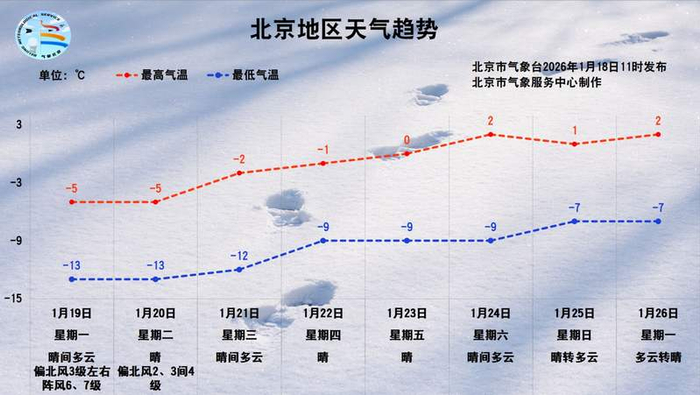 受冷空气影响,未来一周气温都将持续偏低,明后两天白天最高气温仅-5℃左右,风力依旧强劲,使得体感更加寒冷。明后两天夜间最低气温将下降至-13℃,寒意更浓。目前北京处于持续低温黄色预警中,未来几天一定要注意添衣保暖,谨防感冒和心脑血管疾病。