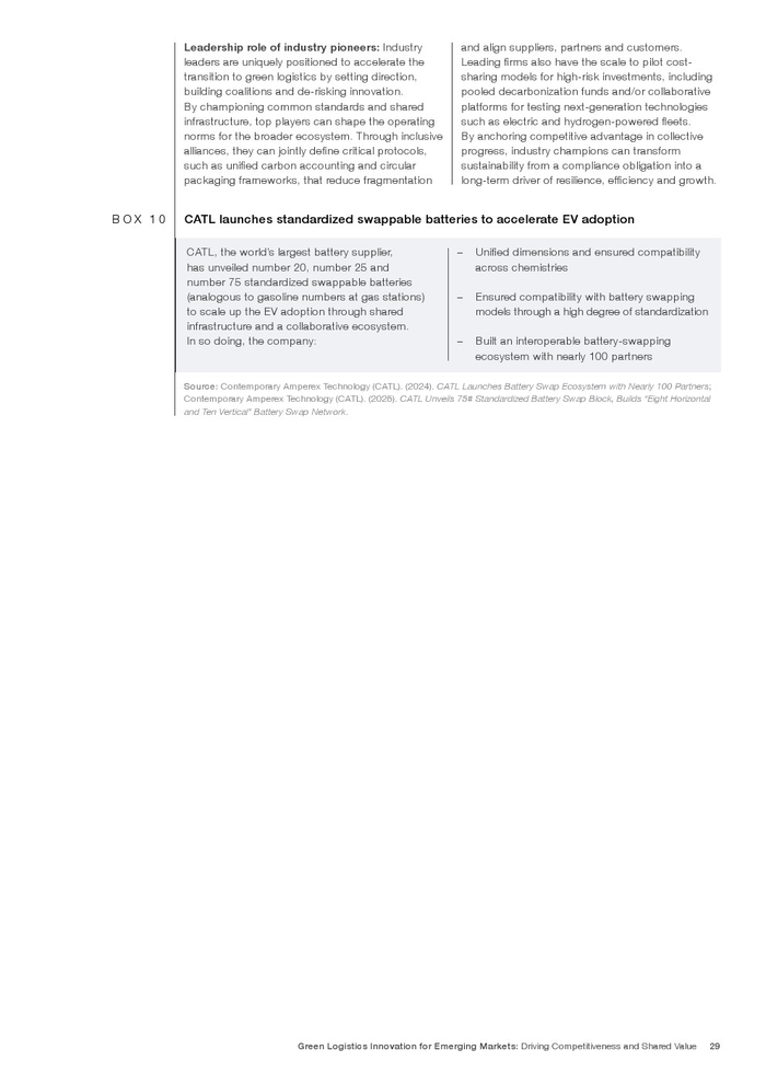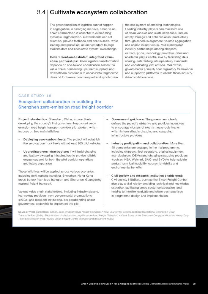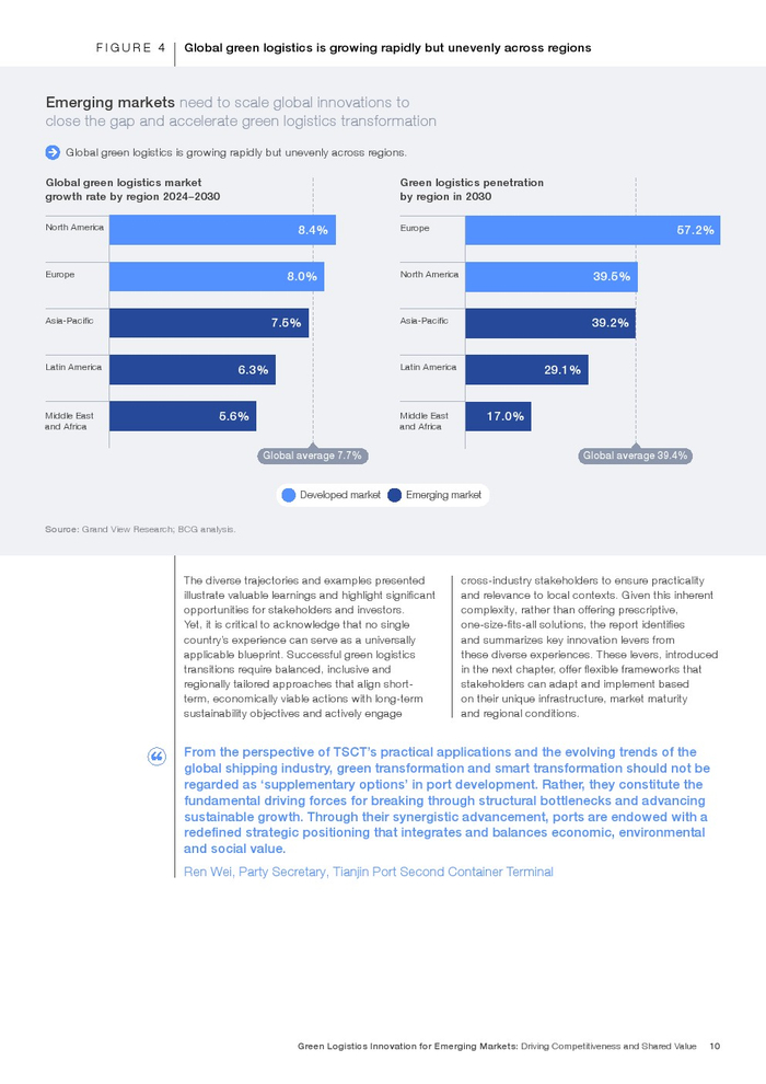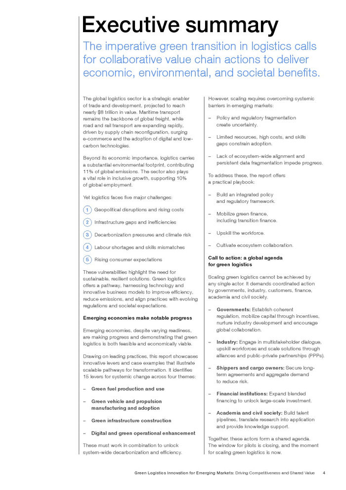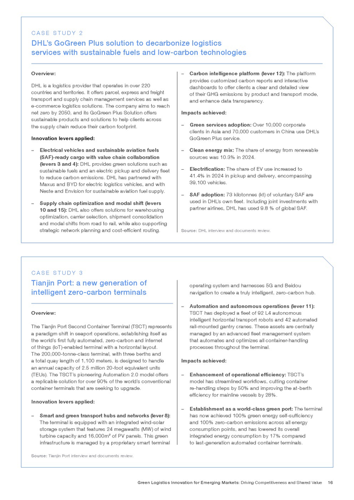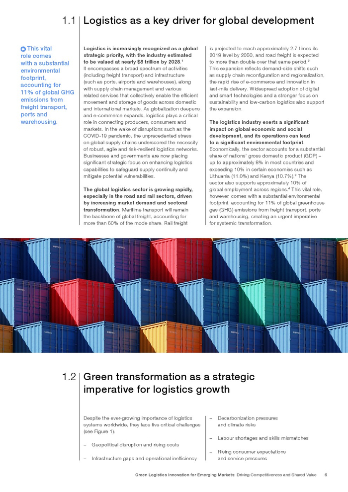 从趋势上看,绿色物流正从试点阶段迈向规模化扩张阶段。未来竞争不再取决于单项技术领先,而取决于谁能更快构建“政策、资本、技术与组织能力”协同的系统能力。在新兴市场,这种协同既是减排路径,也是缩小物流成本差距、重塑全球价值链分工的重要抓手。
