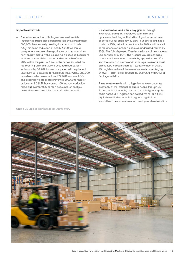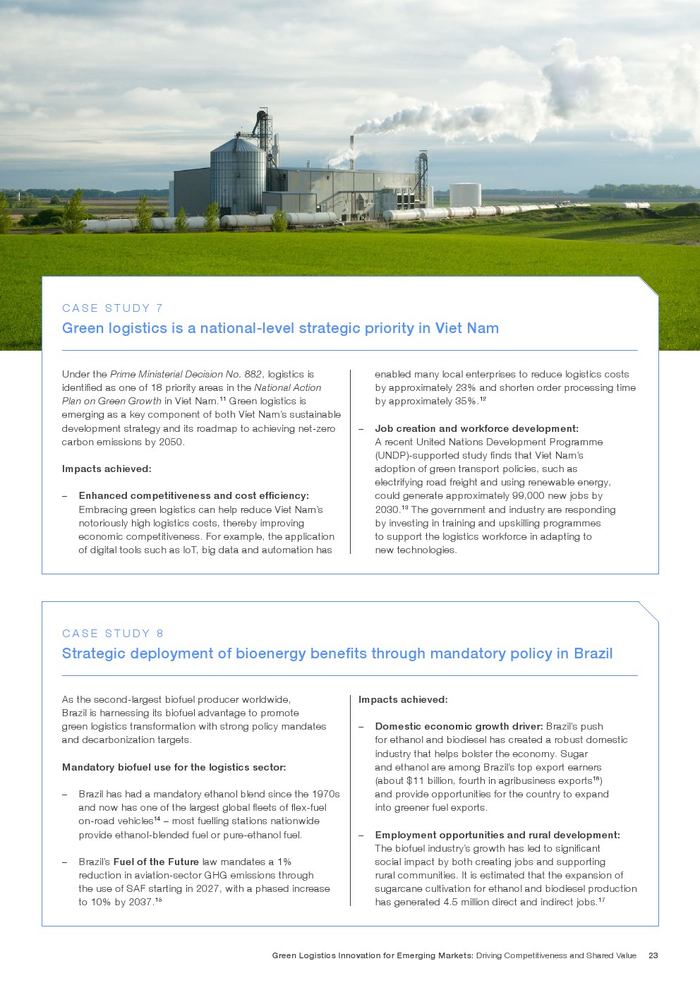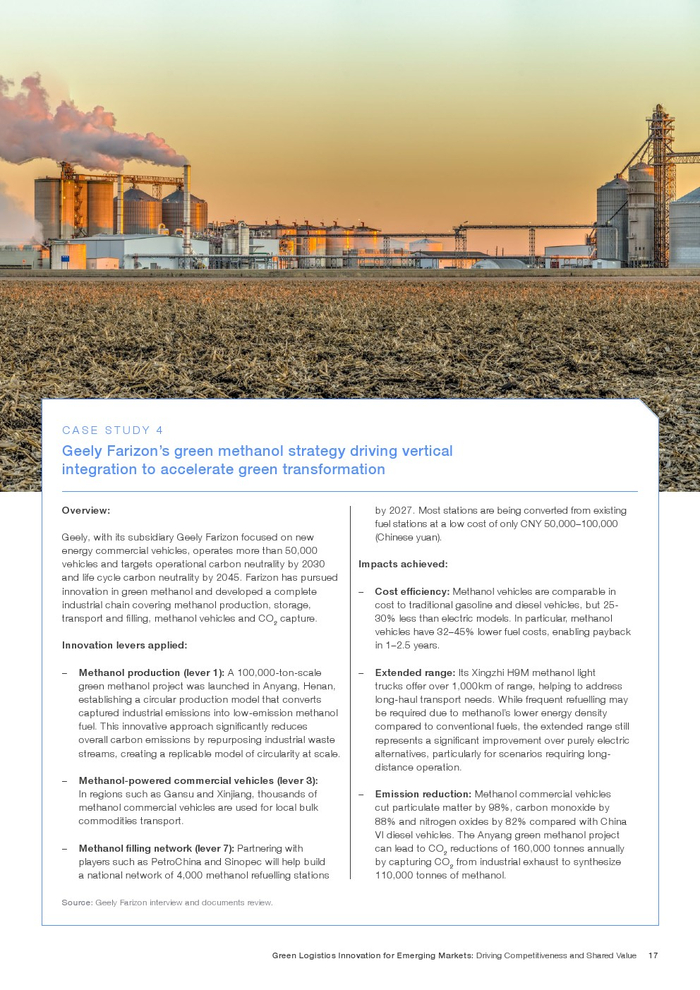 新兴市场案例验证了这一判断。以中国、巴西、越南为代表的经济体,通过政策牵引与商业创新叠加,实现了成本与排放的同步下降。例如,企业层面的多式联运、智能调度和新能源车辆应用,可带来20%以上的效率提升和15%以上的节点成本下降;生物燃料和绿色甲醇项目则在部分地区实现了1至2.5年的投资回收期。这表明绿色物流并非“高成本负担”,而是可量化的生产率工具
