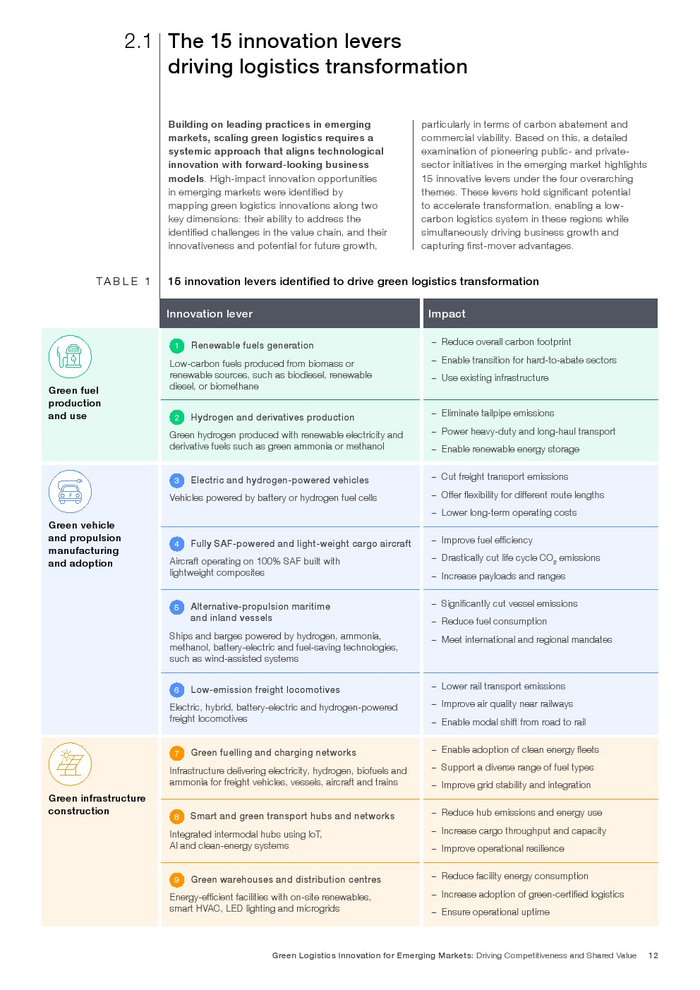 报告以数据梳理了绿色物流的经济潜力。2024至2030年间,全球绿色物流相关市场复合增速普遍在8%至20%之间,其中数字化与绿色运营提升板块增速最高,预计到2030年整体市场规模可达4.5万亿美元。15项创新杠杆被归纳为四类:绿色燃料、绿色运载工具、绿色基础设施以及数字化与运营优化。单一技术难以奏效,系统性组合才是实现降本与减排“双赢”的关键