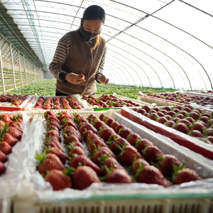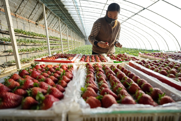 图为农民在河北省滦州市一家现代农业产业园大棚内整理采摘的草莓。