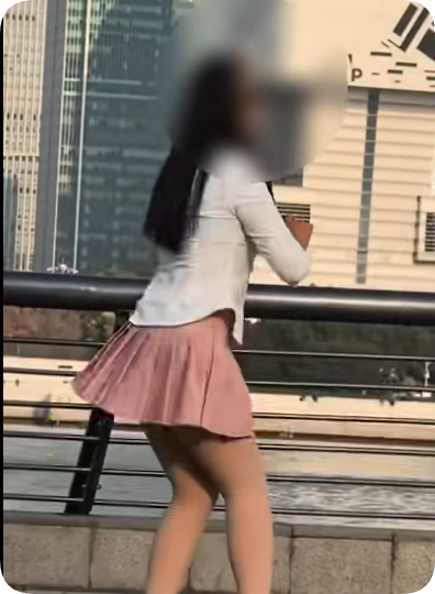 画面显示,这名身穿粉色短裙的女子正对着手机镜头跳舞,现场有不少路人驻足围观,一定程度上阻碍了通道正常通行。