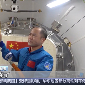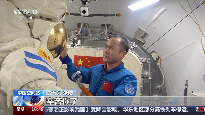 舱外服 B 离开空间站前,航天员们进行了深情告别。
